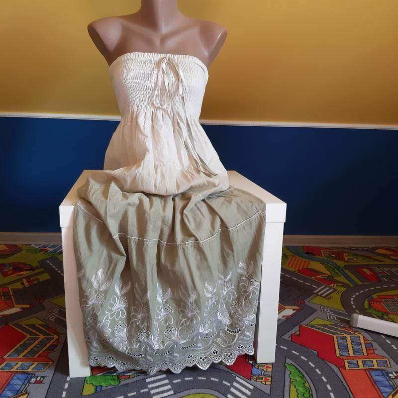 Качественный, с красивой вышивкой внизу сарафан и 100 % хлопка, с подкладкой. Длина 100 см. Можно спускать и носить как юбку в пол. Подойдет на объем груди 90-105 см, бедра - без ограничений) Отправка Новой почтой, УП, наложенный с предоплатой 100 грн