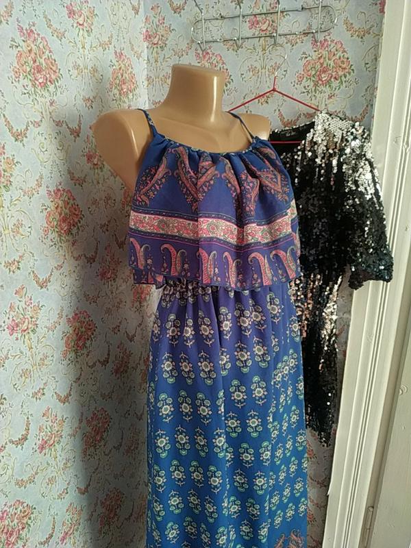 Довжина з бретелями -134см., без -122см. Довжина волана - 24см. пяс на резинці максимально тянеться до - 47-48 см.ПОГ -42Стильний літній сарафан на підкладці. Підійде на розмір S-M, заміри запитуйте 😉 Відправлю Укр,або Новою поштою після оплати 💚🌿