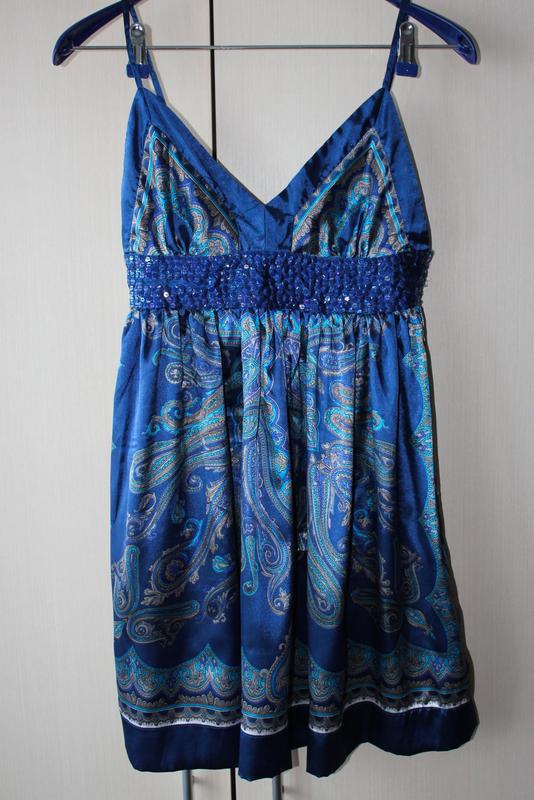 Легкий летний сарафан на тонких регулирующихся бретелях, под грудью резиночка, декоративная вышивка пайетками, сбоку немного распустилось (фото 5). Ткань легкая, непросвещающаяся, внешне похожа на шелк или атлас