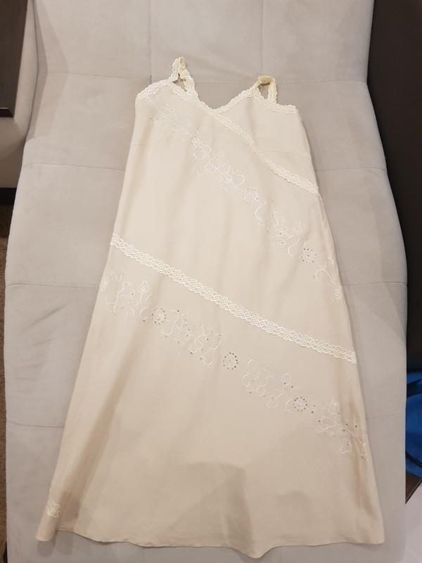 Гарний літній сарафан на жінку кольору беж. Розмір десь 46. Купувала в Метро собі. Носила, коли була вагітна. Влазить велике пузіко). Збоку на молнії. Позаду по спині легка резиночка. Тканина приємна і проста. Бірки немає, але схожий на льон. Влітку як раз не жарко. Продаю, бо чищу свою шафу. Висота по спині 88 см, ПОГ 48 см, ПОТ 46 см. Made in China.