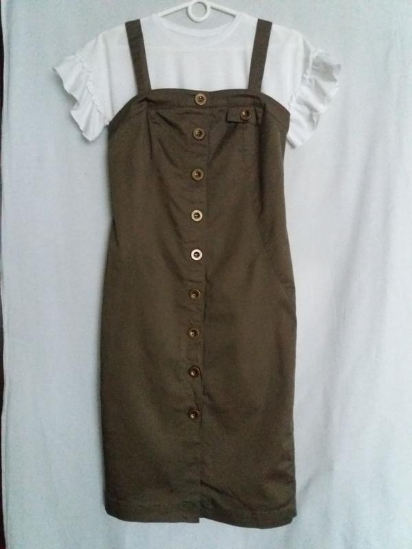 Шлейки в сарафані регулюються, два нижні гудзики розстібаються. На спині прихований замочок. Довжина сарафану - 102 см. Продається без футболки!