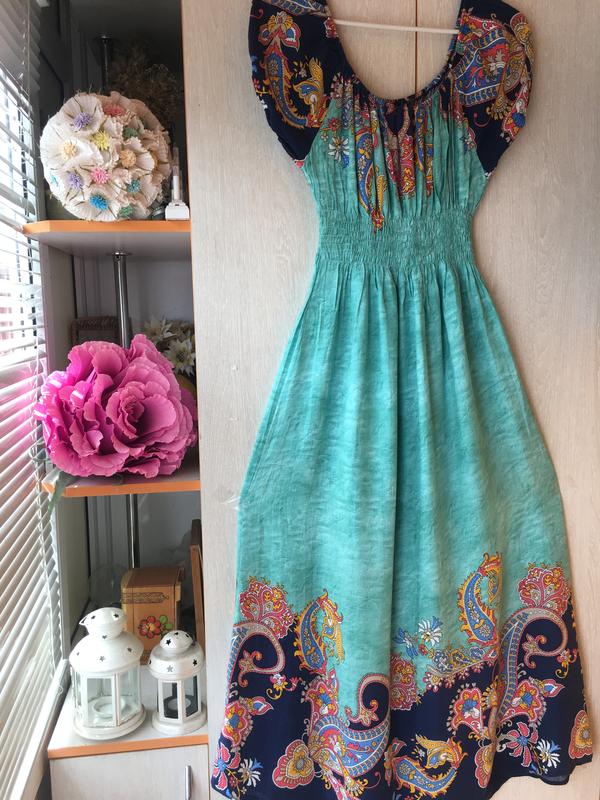 Очень утонченная расцветка. Резинка под грудью умело скрывает животик. Спущенный рукав- фонарик на резинке. Ткань похожа на штапель. Длина - 134 см ПОГ - 27/46 ПОБ - 66 см Ширина внизу (полуокр. 84см )
