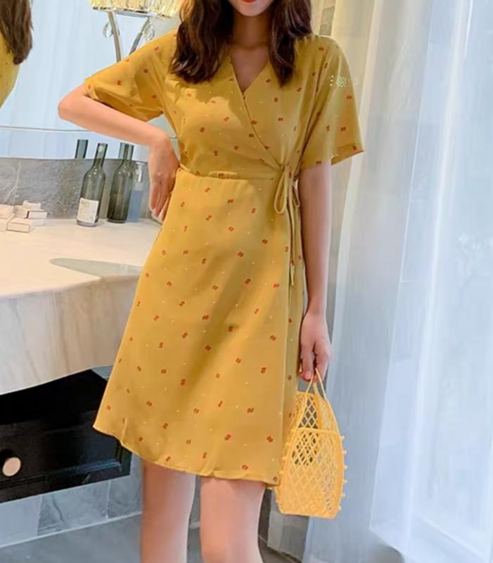 Літня, з легкої тканини сукня з V-образним вирізом, на поясочку. Гірчичний колір з квітами, і мілким горошком. Низ сукні з підкладкою, не просвічується. Довжина сукні 82см. Ширина в талії 42см. Ширина плечей (від строчки до строчки) 34 см. Довжина рукавчика 20 см. Розмір М, але також чудово сяде на S.