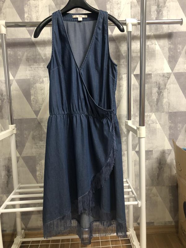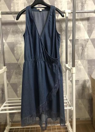 Дуже красиве літнє плаття з бахромою , тренд цього сезону , зроблено під джинс , тканина віскоза , на запах ( всередині є гудзики, на резинці) є кнопочка в районі грудей , відомий американський бренд BOSTON PROPER, купувалося в Америці , розмір вказано s ( але не більше підійде м), одягалось один раз , можна сказати нове Довжина без бахроми ( по спинці) -100 Мінімальна довжина спереду-83 Довжина бахроми-8 Пройма -27 Глибина вирізу -28 Талія -38
