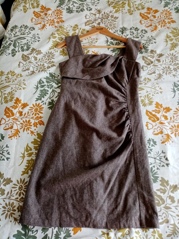 Шерстяной сарафан,очень хорошо подойдет в офис под гольф или блузу.Цвет похож на мокко.Ткань немного колючая,но теплая,на подкладке.Сбоку идут защипы(скрывают что не надо),на груди декоративная полочка(увеличивает грудь)Носила в офис пару раз,но мне стал мал в грудной клетке.Замеры:длина по спине 71+ лямка 16см,пог 40см,ПОТ 35см,ПО низа 53см,ПОБ 52см.Может подойти на S размер.Без дефектов.