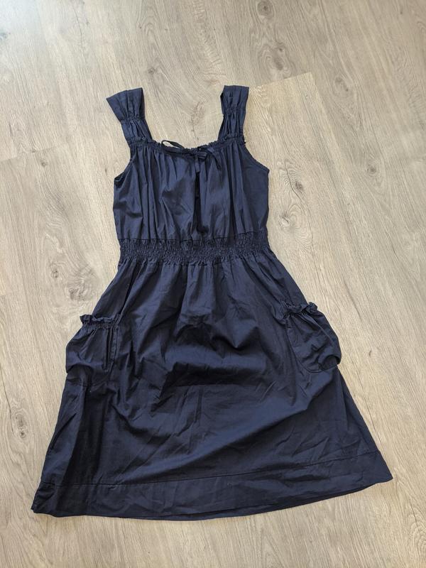 Дуже гарне плаття з бавовни Розмір С-М На гумці, тому тягнеться і може сісти на будь-яку фігуру Стан гарний колір темно синій сукні коротший ніж на фото