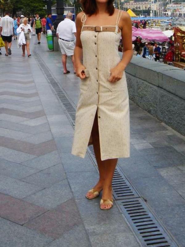 Шикарный стильный сарафан американского бренда Department Cecil United Co. Брали в Америке .Бирки срезаны по понятным причинам . Элегантно смотрится на любой выход . Садится идеально на хорошую фигуру на размер М . Весь на металлических брендированных пуговицах , сзади тоже есть разрез . Качество идеальное . Практически не мнется. Ткань хлопок с плотным стрейчем ; элементы ремней под тонкую замшу . На ПОГ - 42-43 см, ширина по талии - 40 см . на ПОБ- 48-49 см . Извините, торга нет так как уже продаю в полцены ( после родов так и не смогла его носить ) . На фото такой же, но на моей подруге ( покупали два вместе )