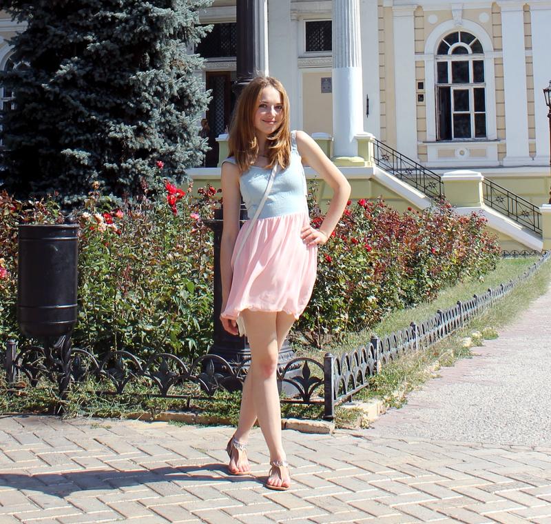 Дуже милий сарафанчик. Топ зашито з блакитного джинса, спідничка з персикового фатину. Зсередини є підклад. На спинці сарафан має зборку з резоночок. Гарно сидить по фігурі і виглядає дуже спокусливо. Розмір підійде на Xs-S Купувала на речовому ринку. Носила один сезон. Стан як у нового. Дефектів немає.