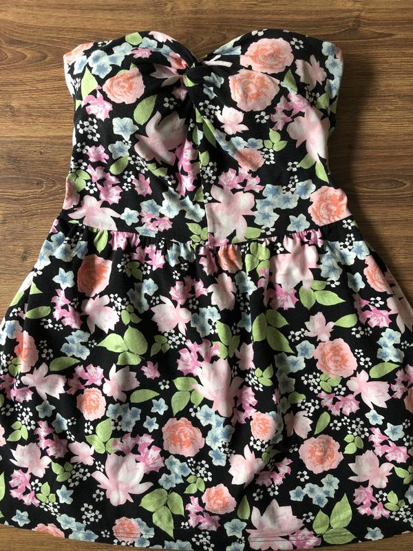 Распродажа 2+1 - при покупке 2-х вещей 3-я по меньшей цене в подарок! Летнее платье-сарафан H&M в цветы на черном фоне, в красивом состоянии, с красивым перекрученным узлом на груди, без лямок, вырез на спине. Можно носить с бюстиком без лямок - сзади будет прятать верхняя деталь. Резинка по краю спинки и по вырезу, а также по линии талии. Бирка с размером срезана, как будто покупка М или 38/40, ориентируйтесь на замеры: ПО верха 39 см, ПО талии 38 см, ПО низу 80 см, длина по боковому шву 65 см. Состав: 95% хлопок, 5% эластан, ткань трикотаж, чуть более плотная футболка, тянется в меру, держит форму.