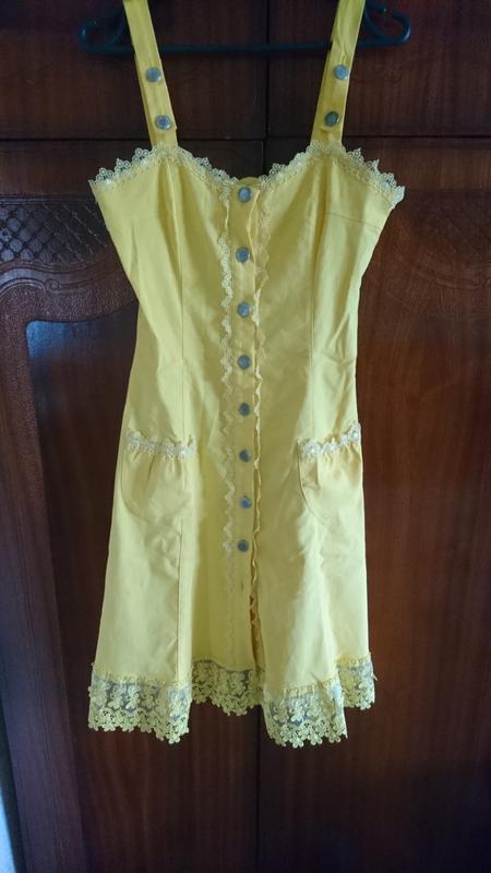 Яркий жёлтый цвет( как на фото 3), стрейч Котон, длина 100(можно регулировать бретелями), грудь 42, талия 37, тянется.