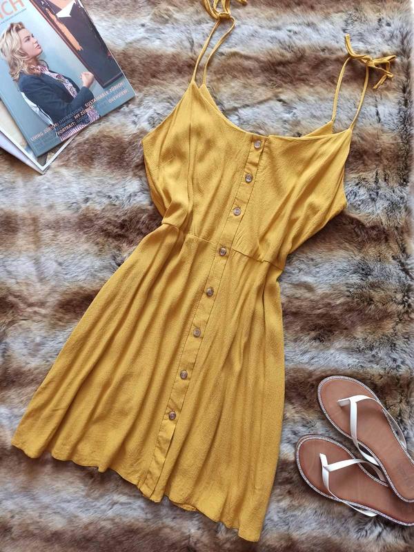 Горчично-желтый сарафан на пуговицах. Натуральная ткань. Стан идеален. Размер M (под поясок можно и на S). ПОГ - 45/47 см, ПОТ - 36/38 см, Бедра свободного кроя. Длина - 85 см(+ бретели регулируются). Дополнительные фото и замеры дамас.