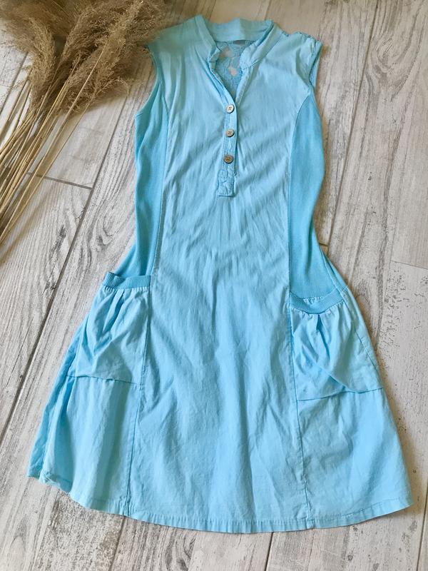 Хлопковое летнее платье сарафан. Чуть выше колена. С красивой кружевной спиной. С полными карманами.