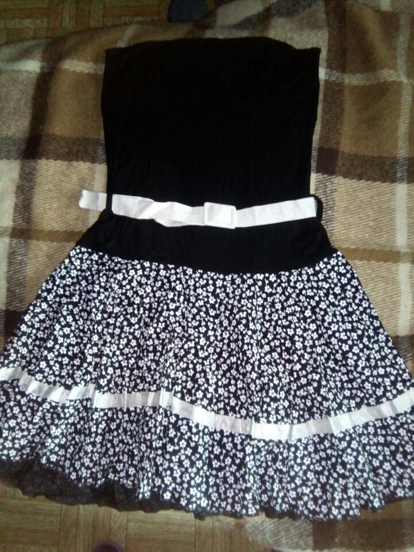 Сарафан без бретелек. В груди тянется. Подойдёт на размер 42-46. Замеры на фото