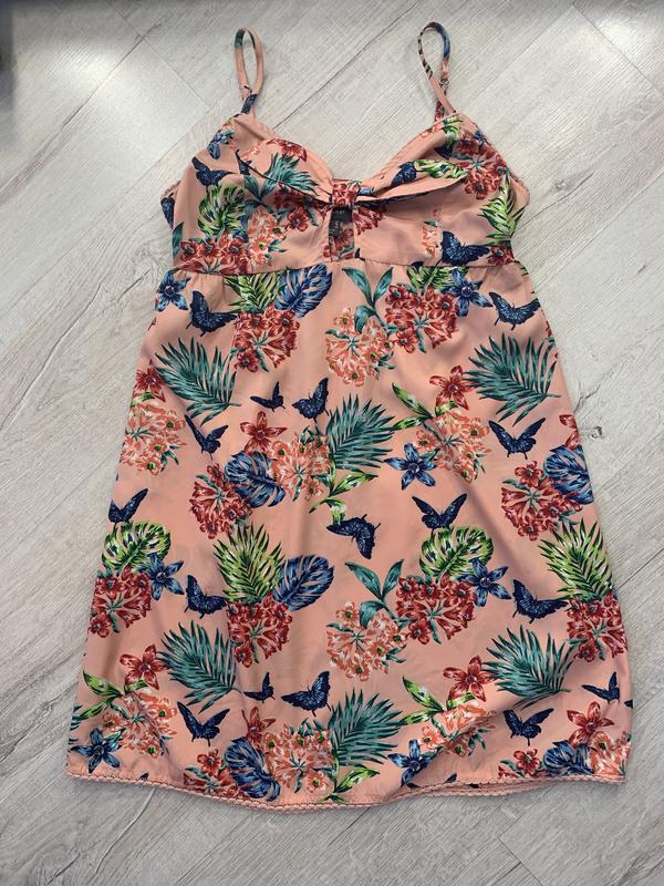 Летний сарафан персикового цвета в цветочный принт. Сарафан на регулируемых бретелях , спереди на груди бант. Фирма Primark, размер М. Длина сарафана 74 см