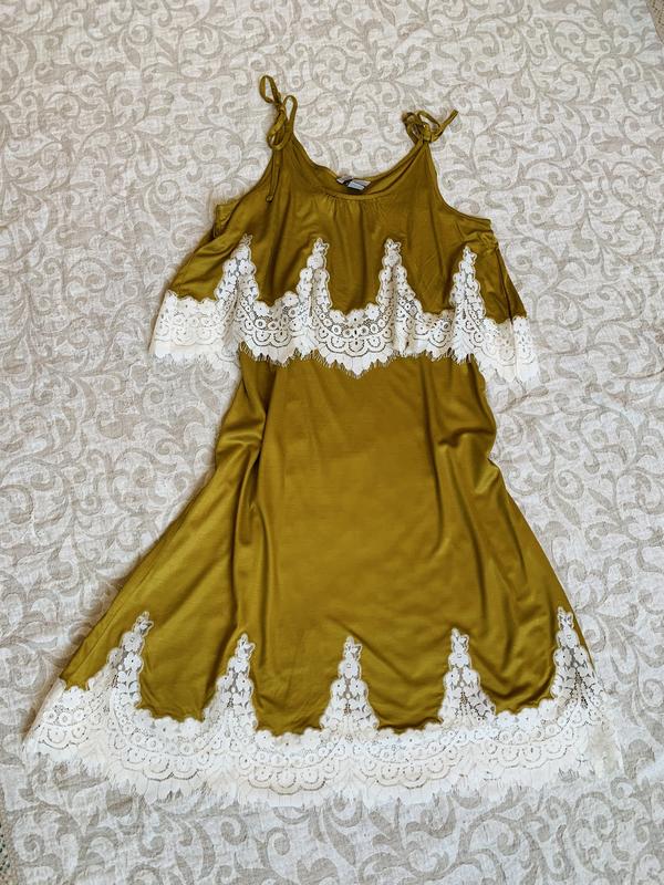 Новый женский сарафан h&m. Шикарное кружево. Размер указан s. Но на м тоже отлично подойдёт. Цвет передать трудно, горчичный с желтым лоском. На свету немного блестит.