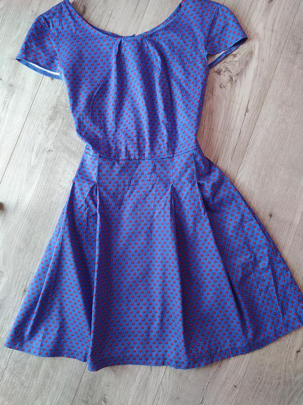 Синий сарафан со звездочками на завязке. На спине скрытая молния. Надевался дважды.