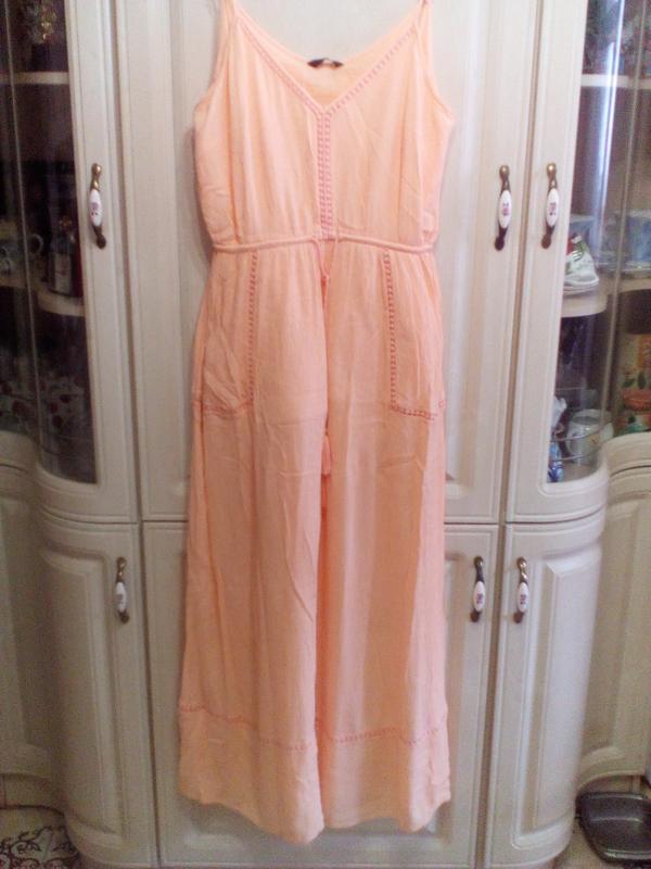 Хлопок, на подкладке батист. Цвет ярче чем на фото, сочный абрикос. Ткань жатка хлопок. В районе груди растягивается до 114 см. Талия на резинке и фиксируется шнурком. По длине можно отрезать 20 см по кружеву Карманы в боках. Подкладку бат истовую можно удалить, просвечиваться не будет.