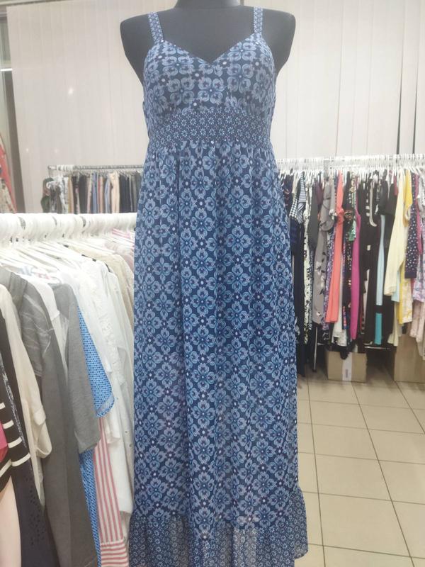 Шифоновый сарафан производства Болгария. Синий с голубым цветочным принтом, подкладка укороченная, темно синяя. Размер UK 10, EUR 38. Полуообхват груди 50, длина изделия 145