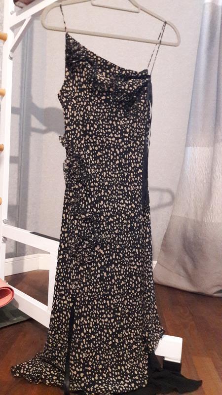 Очень интересная модель. Красивая аппликация в виде змейки и цветка. Спереди драпируется с помощью ленты. На подкладке. Нижняя подкладки также шелковая. Длина-125 примерно ПОГ-44 ПОБ - 45 ПОТ-39-40