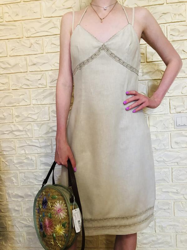 Сарафан в хорошем качестве 100% лён. В идеальном состоянии. Ткань не колется! Стильно смотрится на фигурке! Длинна 89. Грудь 88. Талия 76. Бёдра 108. Длинна без шлеек 89см.
