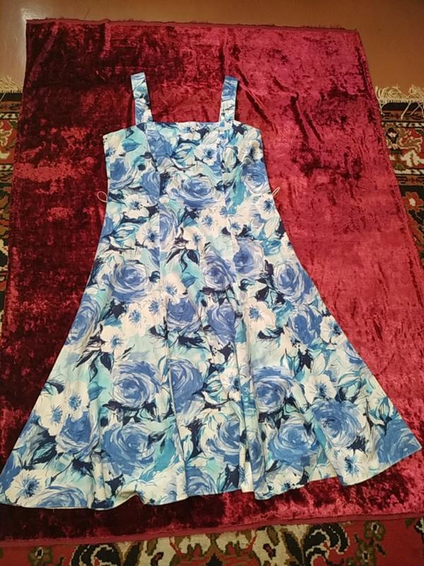 Симпатичный сарафан, состояние отличное,из хлопка . Цветочный принт с поясом, расклешенная юбка.Длина 108 ПОГ 45 ПОТ 43 ПОБ 63 на боку замочек.
