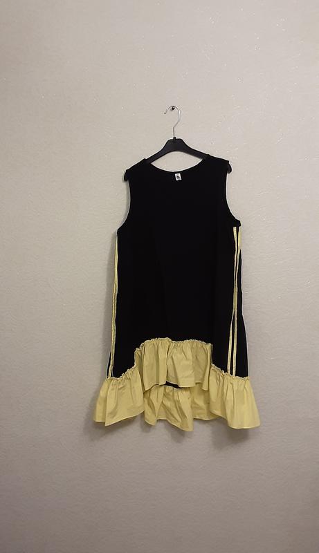 Стильное платье ,очень легкое.По бокам и сзади желтые полоски. Указан размер M (подходит на размер 44-46) Впереди короче.Длина впереди 73 см , длина сзади 93 см,ширина подтмышками 48 см , ширина в плечах 33 см