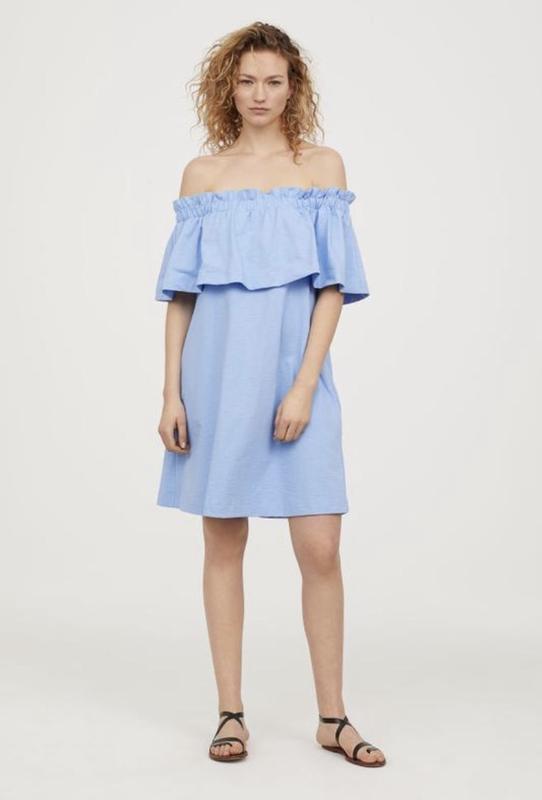 Короткое прямое платье из плотного трикотажа с открытыми плечами. Резинка и широкая оборка сверху, а также карман в боковом шве. Без подкладки. Спрашивайте отвечу на все интересующие вопросы Цвет очень красивый небесно васильковый По бирке размер 40 на размер L Но сядет отлично и на М Длина от волана 76 см Поб 68 см Пог 55 см Ткань натуральная 85% Катона есть еластан ❤️