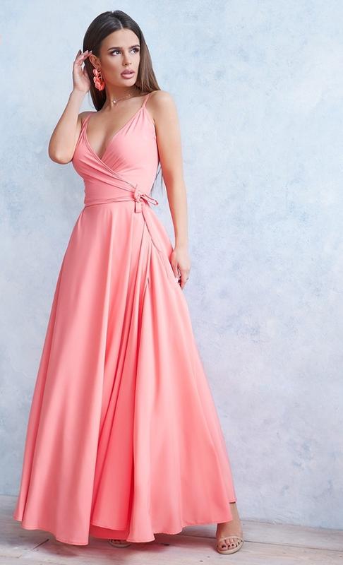 Розовый сарафан с кроем на запах. Состав: 59% полиестр, 21% эластан, 20% хлопок.