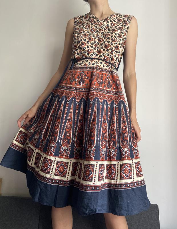 Очень необычное плать/сарафан. Можно одевать на две стороны. Размер m-l, застёгивается на запах.
