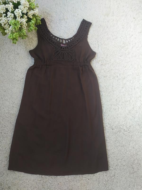 Сарафан темно-коричневого цвета с ажурной вставкой.Длина-97см.,глубина проймы-21.,объем груди-90.,бедра-106.