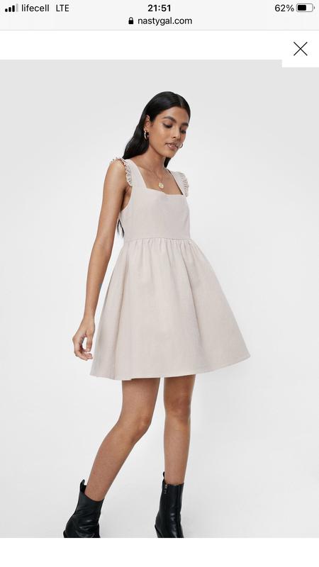 сукня виконана з тканини з льняного вигляду і має квадратний виріз спереду і ззаду, невимушений, міні-силует та бретелі з деталями з рюшами. Розмір-14 {л-хл}