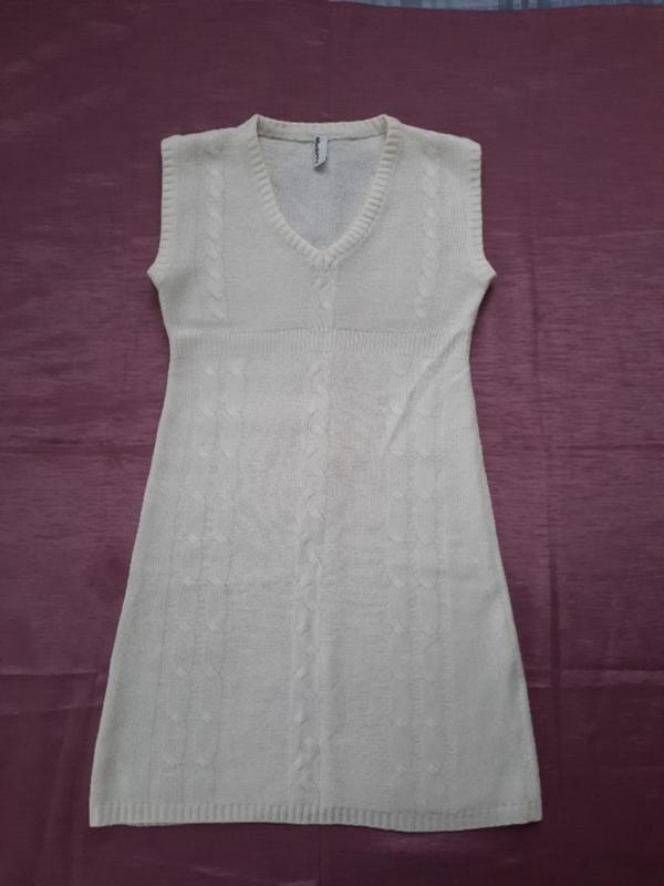 Туника- безрукавка теплая, нежно молочного цвета с вязанным орнаментом. Можно комбинировать с любой блузой или кофточкой. В идеальном состоянии. Плечи 42 ПОГ 48 ПОТ 40 ПОБ 48 По низу ПО 54 Длинна по спинке 89