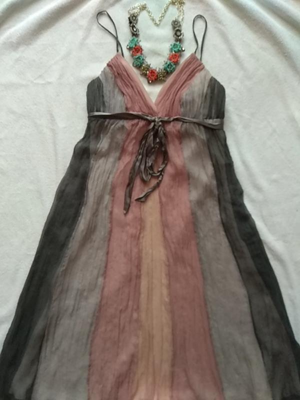 Очень красивое, нежное брендовое платье из натурального шелка. Шелк – один из древних видов натуральных тканей. За долгие годы безупречной службы человеку он приобрел статус самого утонченного и элегантного материала. Нет никакого сомнения в том, что одежда из натуральной ткани не может быть дешевой. Поэтому, когда возникает вопрос что лучше: женское шелковое платье или платье из искусственного аналога, лучше остановить свой выбор на первом варианте.В пастельных тонах. Шикарно ложится по фигуре. Сбоку на замке. Шлейки тонкие, регулируются. На подкладке. Лиф слегка уплотнённый, драпированный. Лиф высота 16 см, ширина 19 см. Завышенная талия. ПОГ 34 см. Под грудью завязывается на шёлковую ленту. Длина платья от груди 80 см. Расклешенное к низу. Смотрится шикарно и дорого. Состояние новой вещи. Дефектов и затяжек нет.