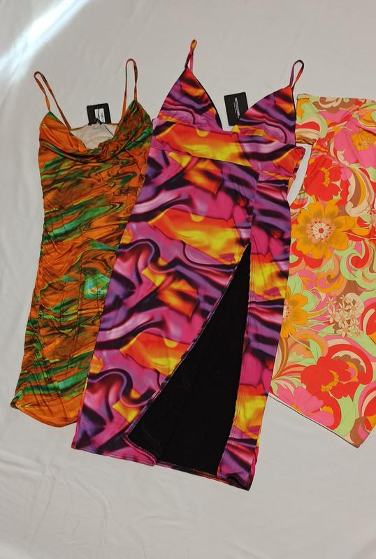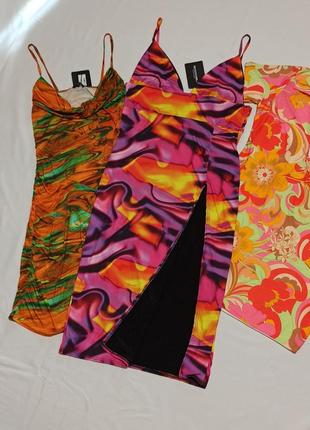 #271038 Платье с ярким цветным принтом. Материал дайвинг, тянется. Вырез спереди, слева по ноге, от бедра. На подкладке. Размер: UK16 (L) Замеры: ПОГ - 44 см ПОТ - 40 см ПОБ - 50 см Длина общая - 116 см (от лямок)