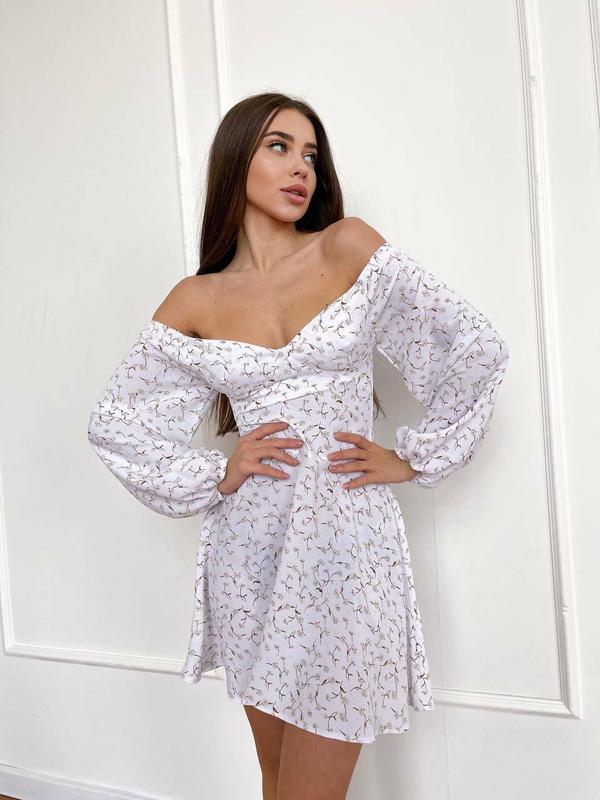 Ніжне і романтичне плаття з красивим квітковим принтом , об'ємні рукави , відкрита лінія плечей роблять його неймовірно женственым. 💫Тканина софт, на спинці потайна змійка. 💫Розмір 42-44 , 44-46 💫Колір білий ‼️Висока якість пошиття і тканини.