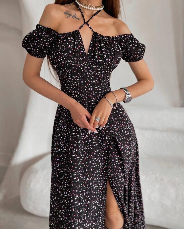 Платье прованс 🌸 Мод. ae 108 Ткань штапель Размер 1(xs-S) 2(m-L) Цвет :небесный ,чёрный (принт )