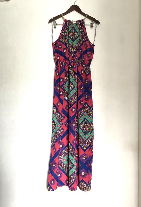 Лёгкий яркий сарафан макси, прямой, на шее золотистая тесьма, но без одной кисточки! Пог до 50, пот резинка 33, поб 65, длинна 150