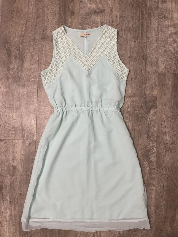 Легенька сукня на розмір с-м, по бірці 10, з підкладкою, колір між ніжно голубим і бірюзовим. Стан хороший. в поясі резинка.