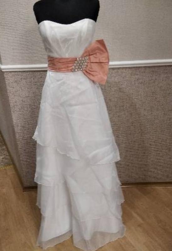 Свадебное платье Цвет белый, пояс цвета коралла, брошь серебро. Размер 42/44 (укр) По запросу сделаю замеры и сброшу доп. фото. Отправлю Новой или Укрпочтой после оплаты на мою карту. Обмена и возврата нет