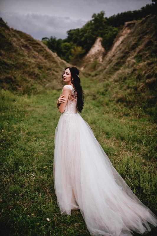 Весільна сукня ручної роботи! Розмір S дуже легка і зручна з красивим шлейфом. Корсет на змійці та на шнуровці. Низ сукні з розрізом під фатином.