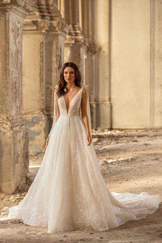 👰🏼♀️Сукня Simona бренду EVA LENDEL. А-силуэт с V-образным вырезом,полностью выполнена из блестящих тканей,молочного цвета. 💫Красивые бантики на рукавах.🎀 ✨Шлейф, который задевается на пуговицы. В комплекті є кільце одиничка. Размер 34-36. На рост 1.55+10 см каблук.