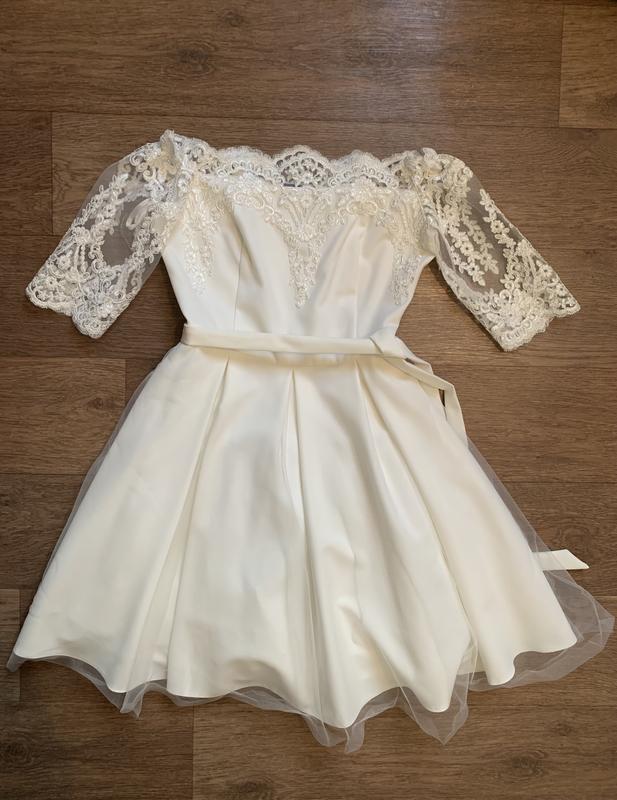 Нежное праздничное платье в идеальном состоянии ( одевалось один раз на свадьбу). Длина 80, грудь 43, рукав 32, плечи 40 см (макс 49) талия 35 см.