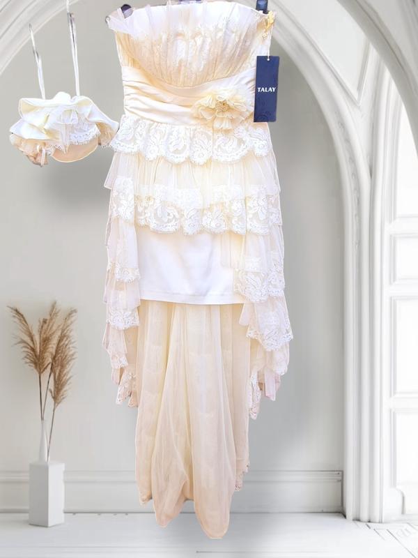 Красивое нетривиальное платье цвета айвори. Новое. размер м. Корсет на завязках, что позволяет регулировать размер. длина юбки 44см поб 45 длина шлейфа от пояса 116см высота лифа 25 см пот 32-33 см Сумочка