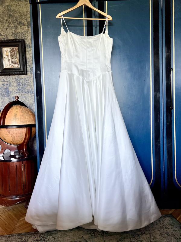 Дуже гарна і лаконічна сукня має шлейф, корсет ефектно підкреслює фігуру, спідниця має флізелінову підкладку, що надає обʼєму і форми, одягалася декілька раз на фотосесію, не була і хімчистці жодного разу, є декілька плʼямок і трішечки запилючився низ, можна акуратно вміло забрати самому. На останніх 4 фото видно нюанси. ПОГ- 45 висота корсет+ бретелі - 44, ПОТ- 39,довж спідниці переду - 105, довж спідниці- шлейфа - 156
