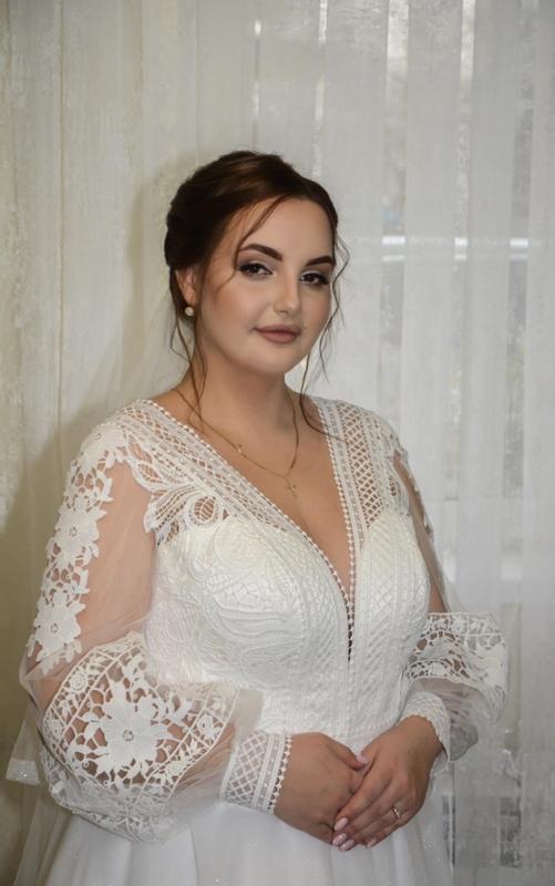 Невероятно красивое свадебное платье Шось по заказу Состояние: после химчистки, идеальный Размер: 52-54 Цена: 8 тысяч гривен Подойдет на рост 160-165 см Имеющийся регулируемый корсет Грудная чашка размера C-D, за счет корсета легко отрегулировать нужный размер Спинка полу открыта и украшена жемчужинками Кружево итальянского производства Низ платья имеет легки блик, на юбке присутствует мелкий шиммер По замерам и более детальное описание употребляться по номеру телефона +38**********
