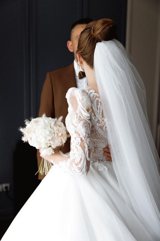 Розкішна весільна сукня «Вікторія» з колекції 2024 - Верх оздоблений бісером та паєтками, (ручна робота)спинка та рукава на ґудзиках , в середині є корсет який регулюється( корсет дуже гарно підкреслює фігуру] - Спідничка білого кольору з легеньким шимером, є підчіпний шлей ( на відео вказано як правильно підчіпати) - Пишність та довжина сукні регулюється кільцями ( може бути без них) - Плечики роблять сукню елегантною - В ідеальному стані,після хімчистки одягалась 1 раз; - Розмір xs-s( регулюється корсетом) - Ріст 162+ каблуки 9 см; - Ог-82 - От-67 - Ціна 15000 ( можливий торг)