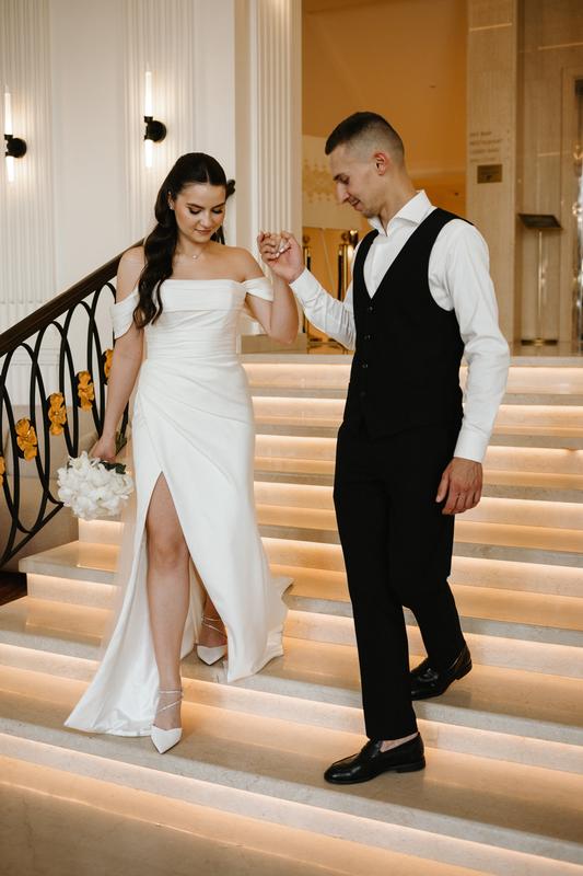 Стан нової. Після професійної хімчистки. Вдягала один раз. Зберігається в чохлі. Присутній невеликий шлейф, рукавчики на застібках (можна відчепити). Комфортна та легка. Розмір - М (38) Зріст - 165 см + каблук 8 см Вартість - 18 000 грн (можливий торг) Відправка НП.