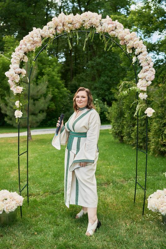 Сукня була створена за індивідуальними замірами, виробник Special Body 21 Вдягнула 1 раз, була ведучою на весіллі Ідеально підійде на розмір XL тканина льон, вишивка комплектація: Кімоно+баска+пояс+чокер Об'єм грудей 110 Під грудьми 92 см Талія 94 Бедра 117 Зріст 152