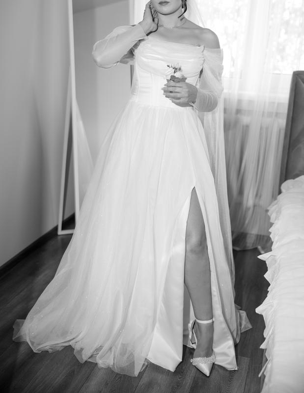 Весільна сукня, так виглядає на розмірі М . Корсетний верх підійде і на L. З якісного матеріалу низ і рукава з сіточки близкучої так само і фата .Мій зріст 158 трохи тягнеться. Тому, підійде і на вищих дівчат. Сукня випрана чиста, без дефектів. В подарунок фата довга. Плаття з гарним розрізом на ніжці. Супер зручна . 😍😍😍