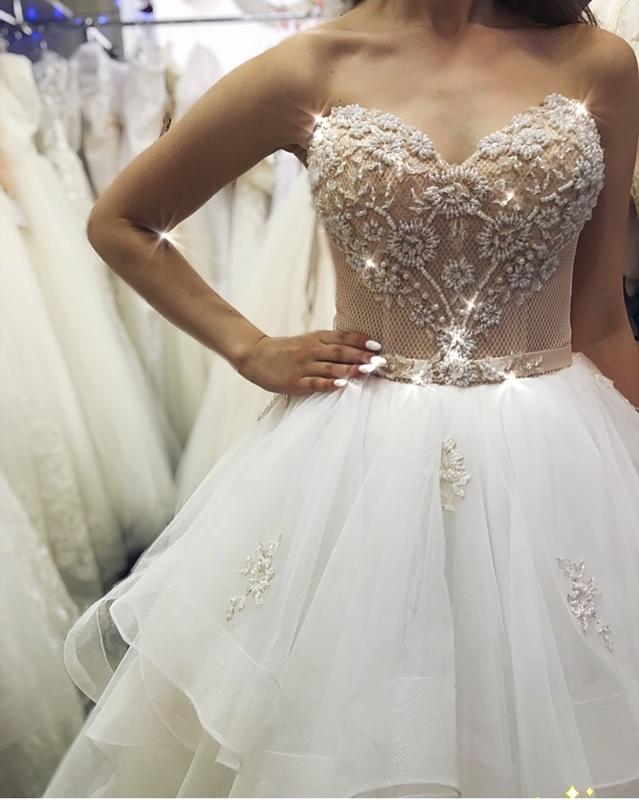Продам свою щасливу весільну сукню розмір XS. Сукня складається з світло-бежевенького корсета і білої пишної спідниці. На корсеті, поясі і зверху на спідниці ручна вишивка. Корсет без щільної підкладки, ледве прозорий, з кісточками. За рахунок бретелей (які шилися по моєму бажанню), корсет не злітав під час активних танців ;) На корсеті 2 стрічки щоб затягувалося чітко по фігурі. До плаття є тканинної під'юпник, що дозволяє носити без кілець, і плаття все одно залишається пишним. Но для удобства у меня было одно кольцо,чтобы в ногах платье не путалось) Платье шилось на мои параметры : Мой рост 156 см ОГ 85 см ОТ 66 см ОБ 89 см Платье надевала под каблук 8 см. Платье не касалось земли, поэтому осталось в целости и сохранности. Последние 2 фото это фото салона,где покупалось платье, на них лучше передается цвет корсета и вышивка. Уже после химчистки!